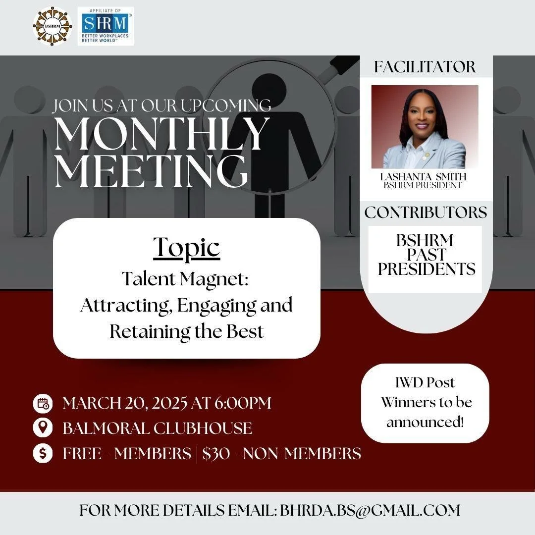 To build a thriving workplace, you need the best talent! Join us for an insightful session on "Talent Magnet: Attracting, Engaging, and Retaining the Best" with BSHRM President, Lashanta Smith, alongside contributions from BSHRM Past Presidents.